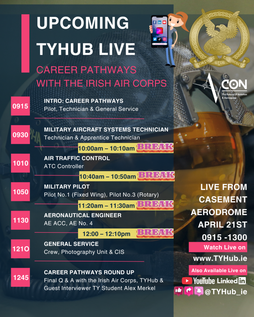 🌍✈️ With exclusive access, TY Hub delved into the thrilling world of The Irish Air Corps, offering a bird’s-eye view of the 3 Career Pathways available. From General Service to TMAST – Trainee Aviation Systems Technician Programme, and the prestigious Pilot Cadetship, we explored what it truly means to soar in the fast-growing Irish Air Corps.